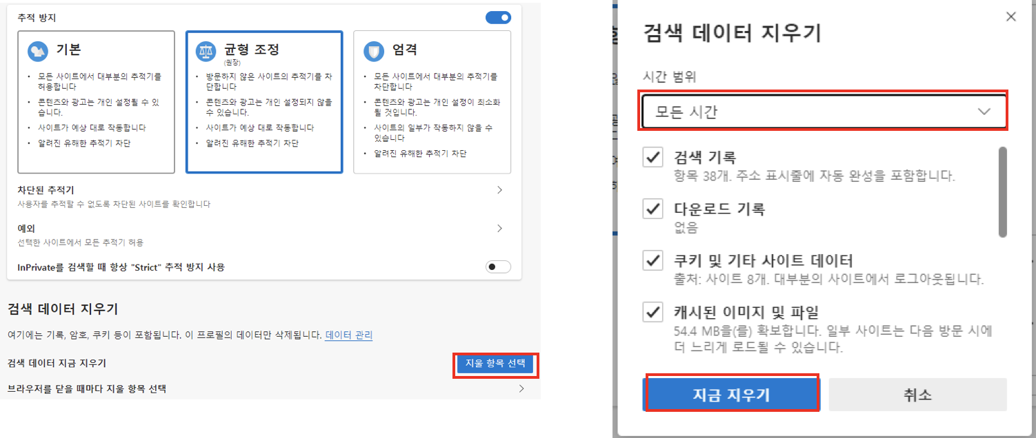 2. 시간 범위를 ‘모든 시간’ 으로 바꾸고, 지금 지우기 버튼을 누릅니다.